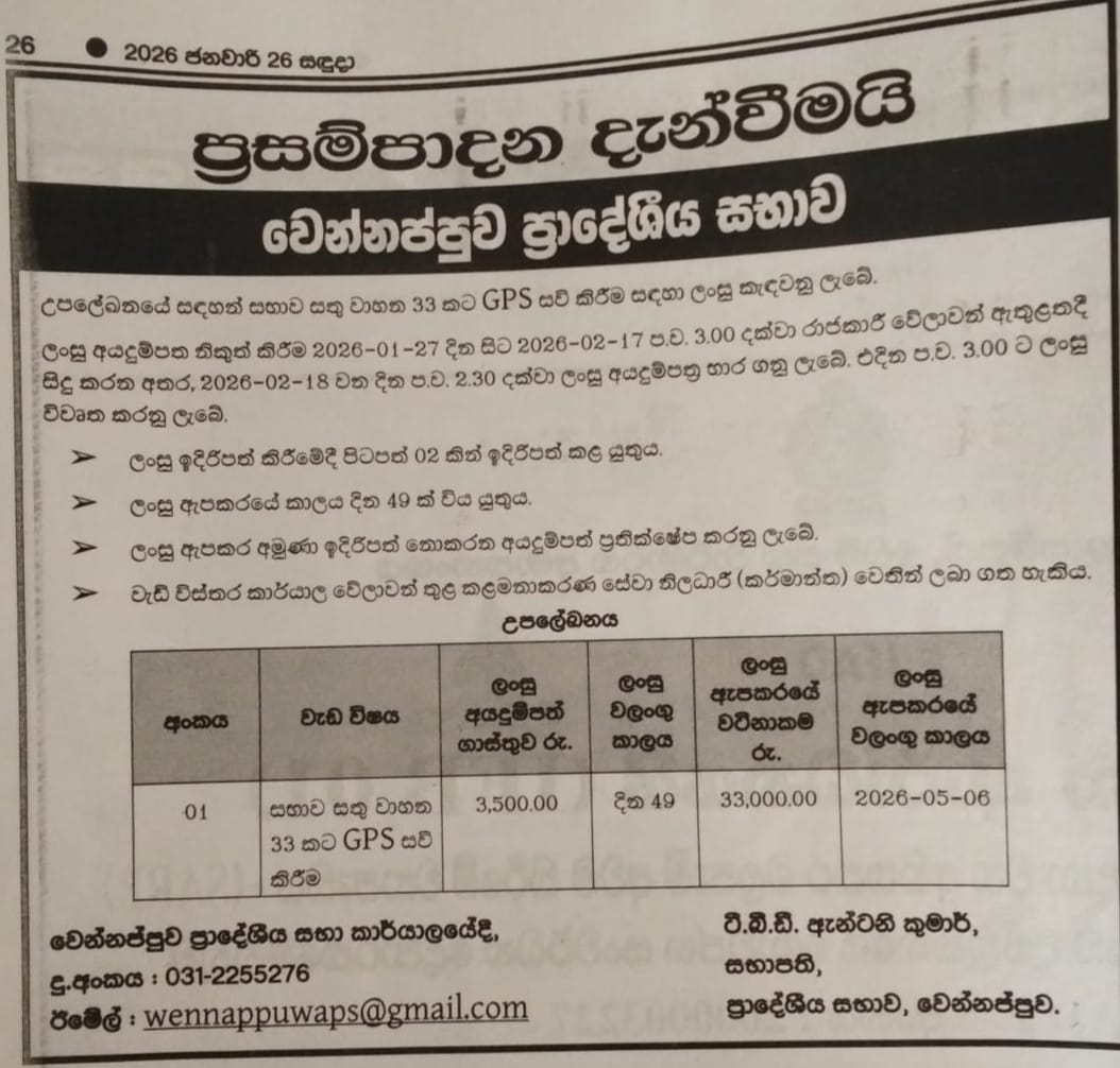 වෙන්නප්පුව ප්රාදේශීය සභාව සතු වාහන 33 කට GPS සවිකිරීමට මිළ ගණන් ලබා ගැනිම