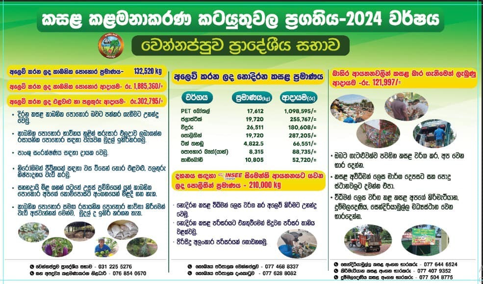 කාර්ය සාධන තරගයේ පළාත් මට්ටමේ තරග විනිශ්චය සදහා විනිශ්චය මණ්ඩලය අප්රේල් 10 දින වෙන්නප්පුව ප්රාදේශීය සභාව වෙත පැමිනෙන ලදී.සියලුම නිලධාරීන් විසින් කාර්ය සාධන තරගය සදහා සාර්ථකව තොරතුරු සකස්කර තිබුනි . ඉදිරිපත් කිරීම ද සාර්ථකයි. සියලුම නිලධාරීන් වෙත ස්තුතිය පුදකර සිටිමි.තොරතුරු සකස්කිරීම සදහා සහයෝගය ලබාදුන් සියලු දෙනාටත් ස්තුතියි .සභාවේ බාහිර ක්රියාකාරකම් ඉතා සාර්ථකව නිමකර තිබූ සියලු දෙනාටත් ස්තුතියි .නියෝජ්ය පළාත් පාලන කොමසාරිස්තුමිය ඇතුළු විනිශ්චය මණ්ඩලයේ සියලු දෙනාටත් ස්තුතියි. තොරතුරු ඉදිරිපත් කරමින් සහයෝගය ලබා දුන් වෙන්නප්පුව හා දංකොටුව සෞඛ්ය වෛද්ය නිලධාරීතුමන්ලාට ,මහජන සෞඛ්ය පරීක්ෂකතුමන්ලාට හා පවුල් සෞඛ්ය සේවා නිලධාරීතුමියන්ට ස්තුතිය පුදකර සිටිමි . එකමුතු වෙමු.සතුටින් වැඩ කරමු. ලේකම්, වෙන්නප්පුව ප්රාදේශීය සභාව